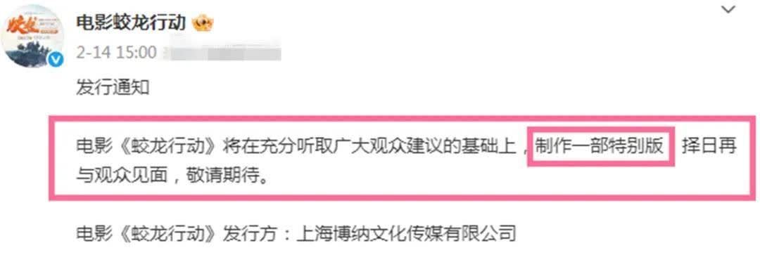 效用,说“毫不撤档”几天之后,《蛟龙活动》却在2月14日发文晓示撤档,说“电影《蛟龙活动》将在充分听取雄壮不雅众提议的基础上,制作一部罕见版,择日再与不雅众碰面,敬请期待”。