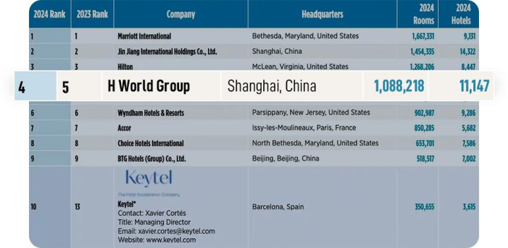 图注:华住集团位列《HOTELS》杂志“2024民众旅舍集团205强”榜单第四