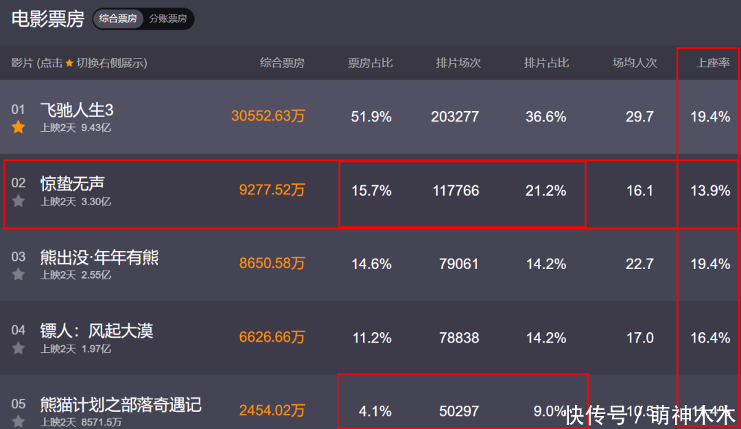 除了评分以外,网友还发现,别看《惊蛰无声》日票房排在第二,上座率却是四部破亿新片中最低的,以至也曾六部电影中票房倒挂最严重的,两偶然津数据和排在倒数的《熊猫相关之部落奇遇记》差未几,又是一部不足预期的大片。
