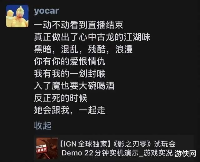 7月26日,IGN发布《影之刃零》试玩会22分钟实机演示视频,《黑外传:悟空》主创冯骥在一又友圈转发了该实机,并配文抒发对游戏的抚玩: