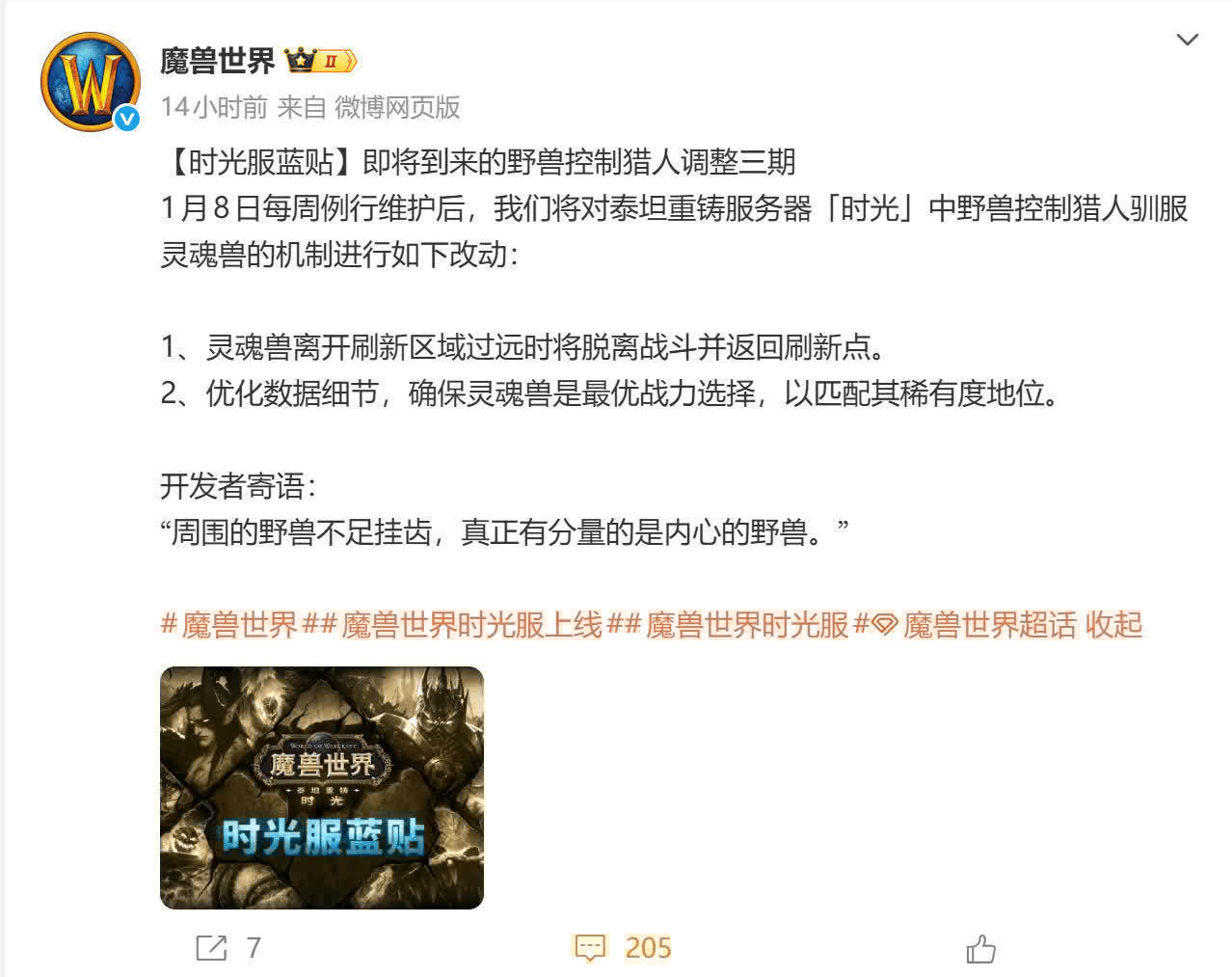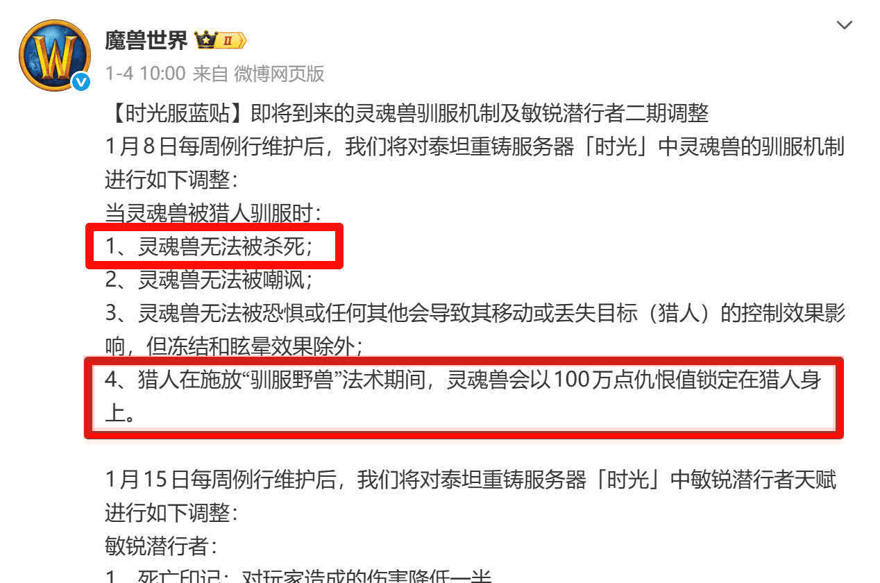 估摸这轮魔兽寰宇时光服针对猎东谈主工作的改变大约已完成。在这次改变中,系数宠物齐赢得了对等参预副本的资历,在此基础上,灵魂兽又得到了一项出奇加强。农工认为这既在预念念除外开云(中国)Kaiyun·体育官方网站-登录入口,又在根由之中,毕竟灵魂兽的获取门槛高于其他宠物,赐与一定出奇优待也无可厚非。但是,官方似乎我方打了脸,那么这次究竟改了些什么呢?