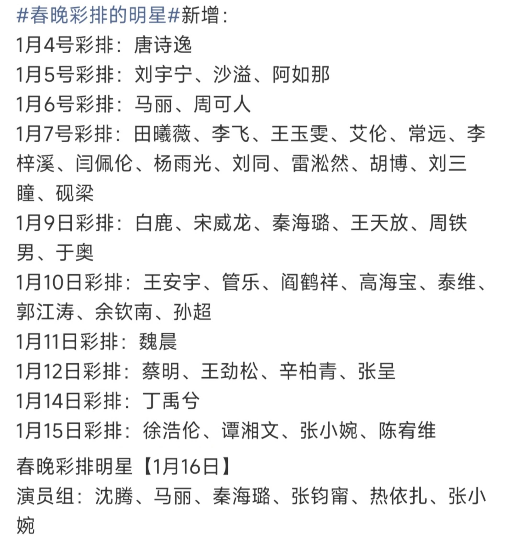 两次联排威望曝光,新老形貌皆聚马年央视春晚照旧从1月初就运行彩排,超多明星赓续现身春晚的彩排现场,从1月4日彩排运行到第一次联排阶段,就包括了刘宇宁、田曦薇、沙溢、王玉雯、张杰、白鹿、沈腾、马丽、蔡明、丁禹兮、王安宇、周深、凤凰传说、魏晨等加盟在内的40多位明星。