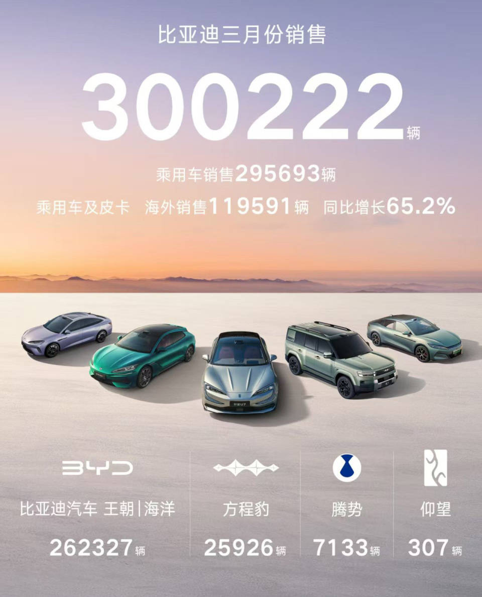 比亚迪近日公布了3月销售数据,单月销量破裂30万辆,重新夺归国内车企销量冠军宝座,较第二名跨越近5万辆。这一收货不仅展现了比亚迪在新能源汽车市集的强盛复苏,也象征着旧年第四季度因购置税调遣激发的奢华提前开释效应已自由消退,头部新能源车企的市集表示重回正轨。