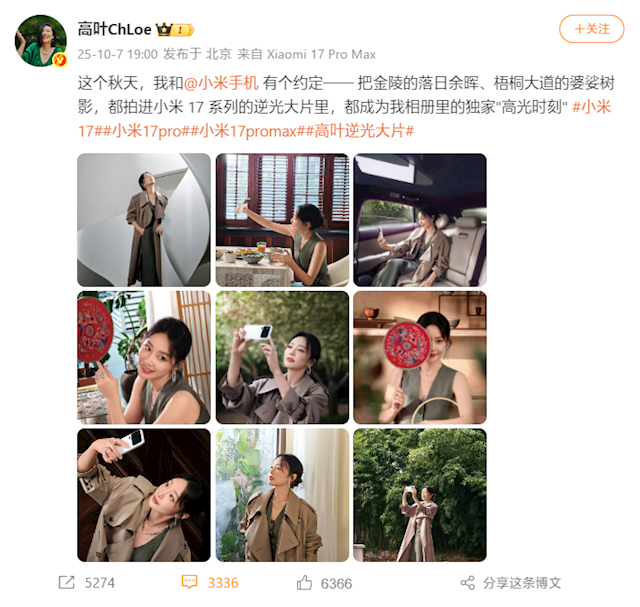 快科技10月7日音信,演员高叶今天晒出了我方用小米17 Pro Max拍摄的相片,其中不少逆光场景也拍摄出了赫然的东谈主像大片,告别黑脸。